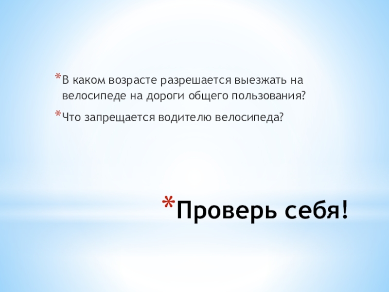 Проверь себя!В каком возрасте разрешается выезжать на велосипеде на дороги общего пользования?Что запрещается водителю велосипеда?
