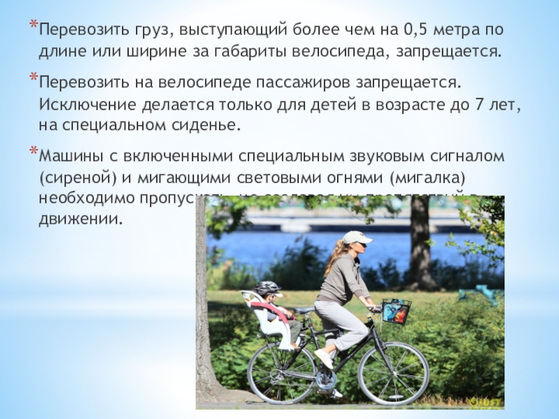Перевозить на велосипеде пассажиров запрещается. Исключение делается только для детей в возрасте до 7 лет, на специальном сиденье.