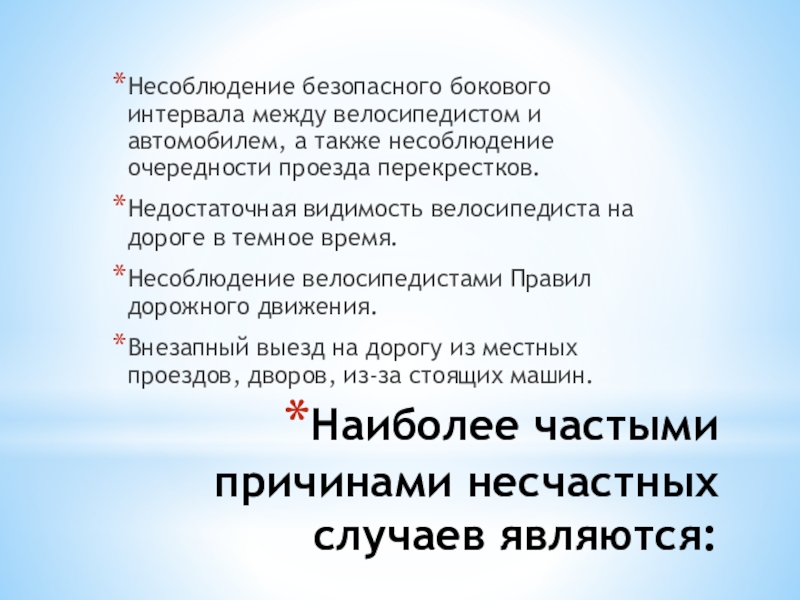 Наиболее частыми причинами несчастных случаев являются: Несоблюдение безопасного бокового интервала между велосипедистом и автомобилем, а также несоблюдение