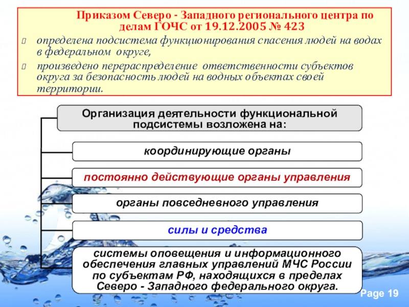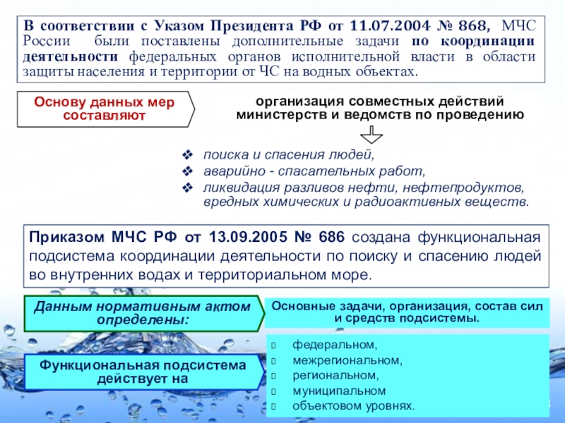 В соответствии с Указом Президента РФ от 11.07.2004 № 868, МЧС России были поставлены дополнительные задачи по координации деятельности федеральных органов исполнительной власти в области защиты населения и территории от ЧС на водных объектах.