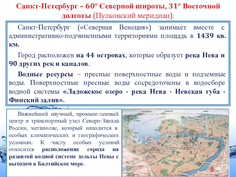 Санкт-Петербург («Северная Венеция») занимает вместе с административно-подчиненными территориями площадь в 1439 кв. км.