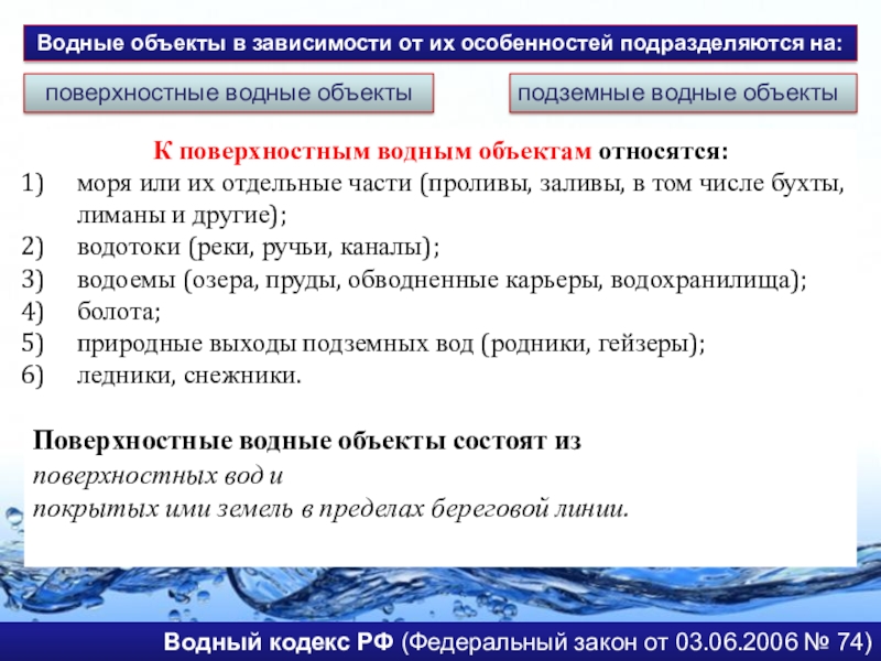 Водные объекты в зависимости от их особенностей подразделяются на: