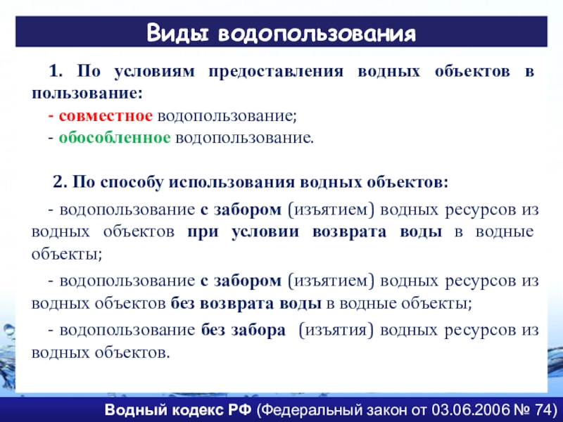 Использование водных объектов (водопользование) - использование различными способами водных объектов для удовлетворения потребностей РФ, субъектов РФ, муниципальных образований, физических лиц, юридических лиц.