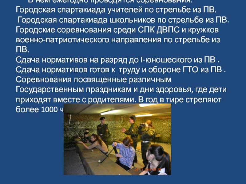 ПВ. Городская спартакиада школьников по стрельбе из ПВ. Городские соревнования среди СПК ДВПС и кружков военно-патриотического направления по стрельбе из ПВ. Сдача нормативов на разряд до I-юношеского из ПВ . Сдача нормативов готов к труду и обороне ГТО из ПВ . Соревнования посвященные различным Государственным праздникам и дни здоровья, где дети приходят вместе с родителями. В год в тире стреляют более 1000 человек.