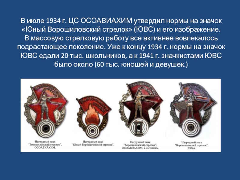 В июле 1934 г. ЦС ОСОАВИАХИМ утвердил нормы на значок «Юный Ворошиловский стрелок» (ЮВС) и его изображение.