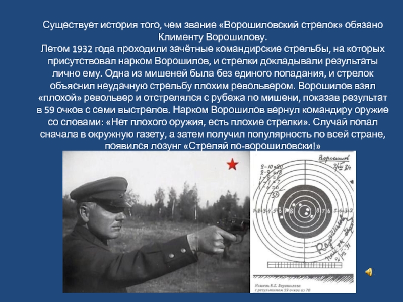 Слайд 2Существует история того, чем звание «Ворошиловский стрелок» обязано Клименту Ворошилову. Летом 1932