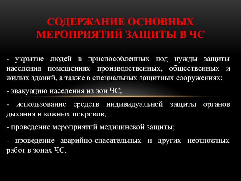 СОДЕРЖАНИЕ ОСНОВНЫХ МЕРОПРИЯТИЙ ЗАЩИТЫ В ЧС