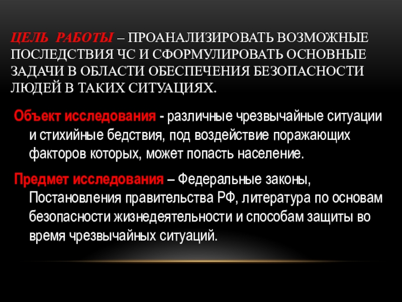 Предмет исследования – Федеральные законы, Постановления правительства РФ, литература по основам безопасности жизнедеятельности и способам защиты во время чрезвычайных ситуаций.