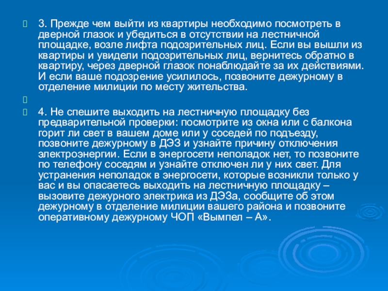 и убедиться в отсутствии на лестничной площадке, возле лифта подозрительных лиц. Если вы вышли из квартиры и увидели подозрительных лиц, вернитесь обратно в квартиру, через дверной глазок понаблюдайте за их действиями. И если ваше подозрение усилилось, позвоните дежурному в отделение милиции по месту жительства.