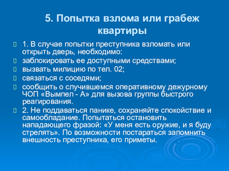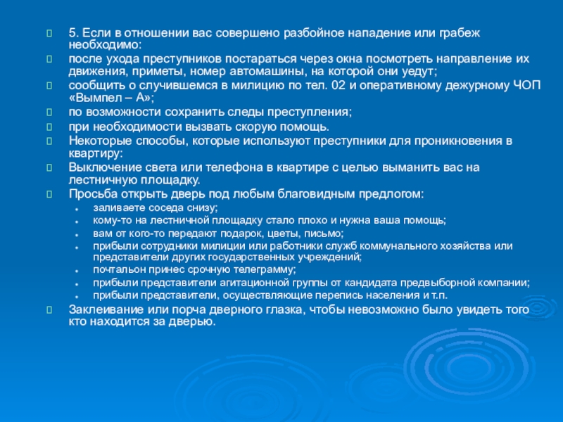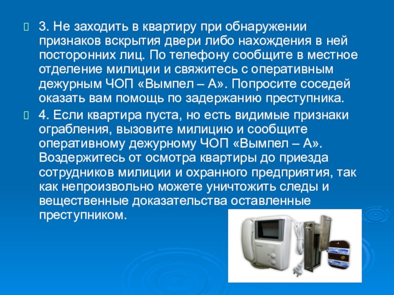 4. Если квартира пуста, но есть видимые признаки ограбления, вызовите милицию и сообщите оперативному дежурному ЧОП «Вымпел – А». Воздержитесь от осмотра квартиры до приезда сотрудников милиции и охранного предприятия, так как непроизвольно можете уничтожить следы и вещественные доказательства оставленные преступником.