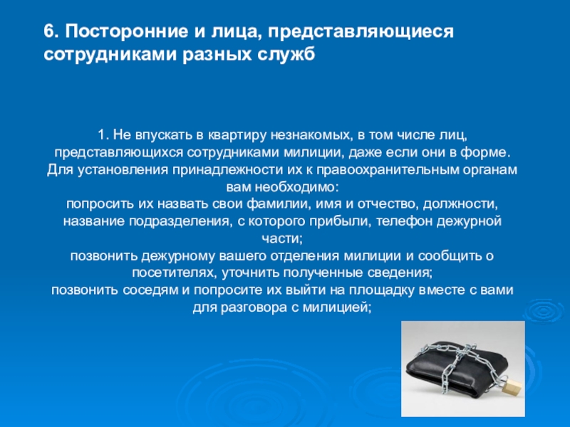в квартиру незнакомых, в том числе лиц, представляющихся сотрудниками милиции, даже если они в форме. Для установления принадлежности их к правоохранительным органам вам необходимо: