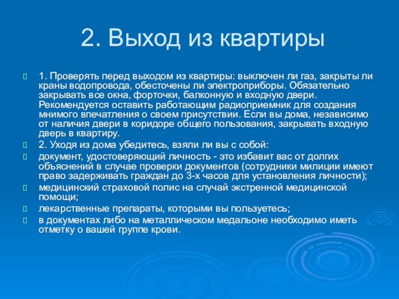 ли газ, закрыты ли краны водопровода, обесточены ли электроприборы. Обязательно закрывать все окна, форточки, балконную и входную двери. Рекомендуется оставить работающим радиоприемник для создания мнимого впечатления о своем присутствии. Если вы дома, независимо от наличия двери в коридоре общего пользования, закрывать входную дверь в квартиру.