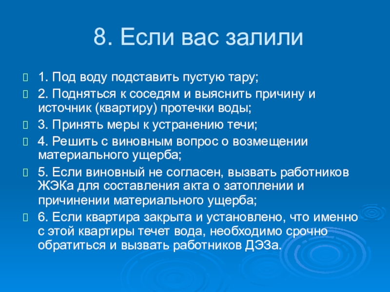 6. Если квартира закрыта и установлено, что именно с этой квартиры течет вода, необходимо срочно обратиться и вызвать работников ДЭЗа.