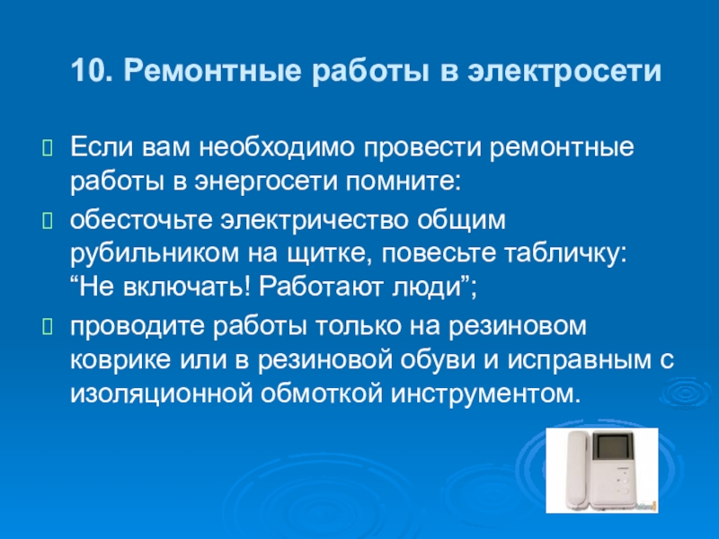 обесточьте электричество общим рубильником на щитке, повесьте табличку: “Не включать! Работают люди”;