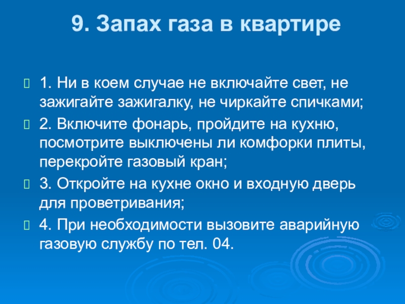 8. В случае невозможности немедленно покинуть задымленное помещение и чтобы не отравиться угарным газом необходимо лечь на пол, намочить платок, тряпку или рукав одежды водой, закрыть органы дыхания и ползком перемещаться к выходу