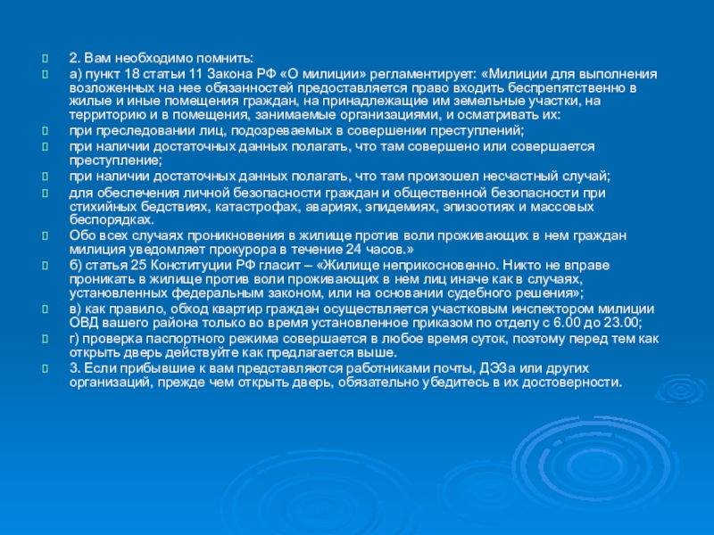 в) как правило, обход квартир граждан осуществляется участковым инспектором милиции ОВД вашего района только во время установленное приказом по отделу с 6.00 до 23.00;