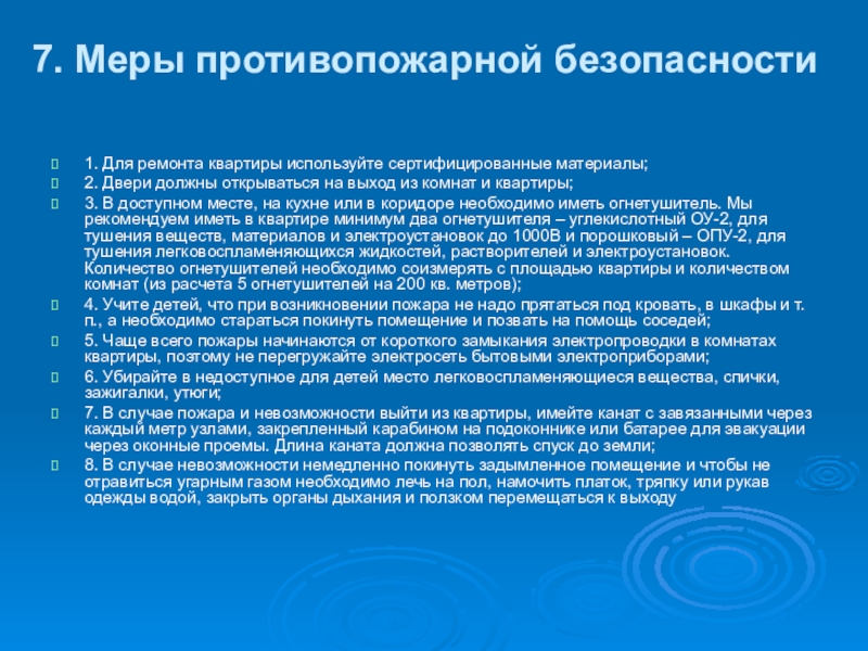 5. Чаще всего пожары начинаются от короткого замыкания электропроводки в комнатах квартиры, поэтому не перегружайте электросеть бытовыми электроприборами;