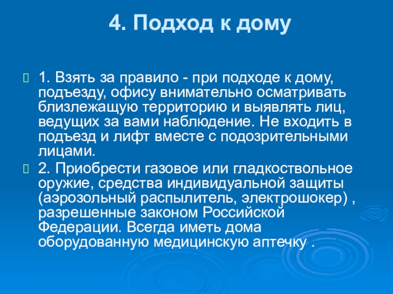 к дому, подъезду, офису внимательно осматривать близлежащую территорию и выявлять лиц, ведущих за вами наблюдение. Не входить в подъезд и лифт вместе с подозрительными лицами.