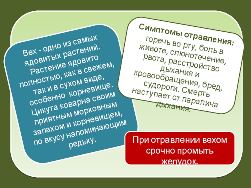 горечь во рту, боль в животе, слюнотечение, рвота, расстройство дыхания и кровообращения, бред, судороги. Смерть наступает от паралича дыхания.