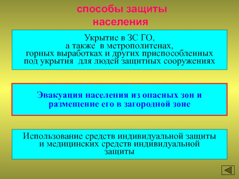 способы защиты населения Укрытие в ЗС ГО, а также в метрополитенах, горных выработках и других приспособленныхпод