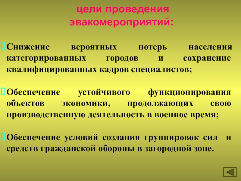 цели проведения эвакомероприятий:Снижение вероятных потерь населения категорированных городов и сохранение квалифицированных кадров специалистов;Обеспечение устойчивого функционирования объектов