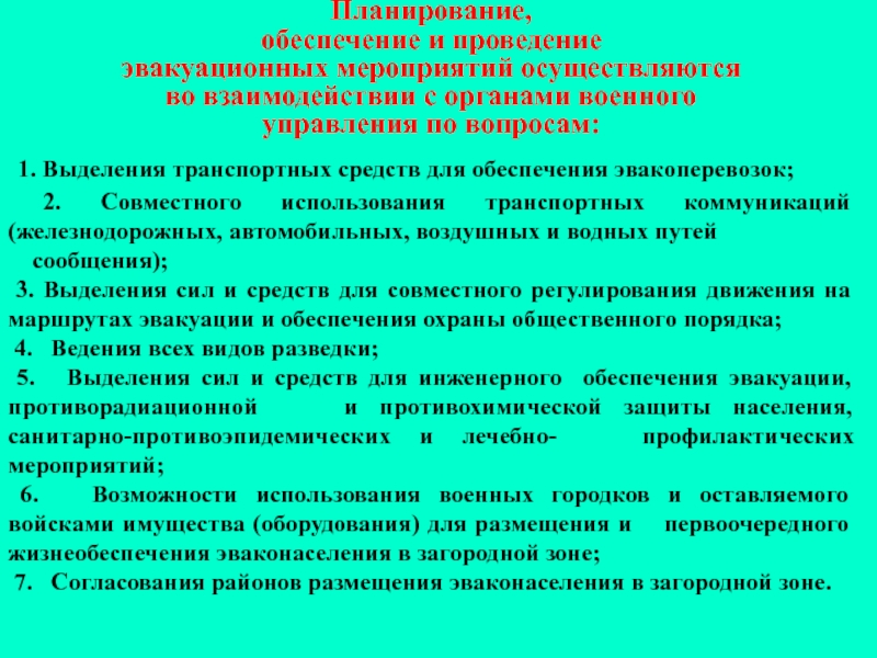 Планирование, обеспечение и проведениеэвакуационных мероприятий осуществляются во взаимодействии с органами военного управления по вопросам: 1. Выделения транспортных