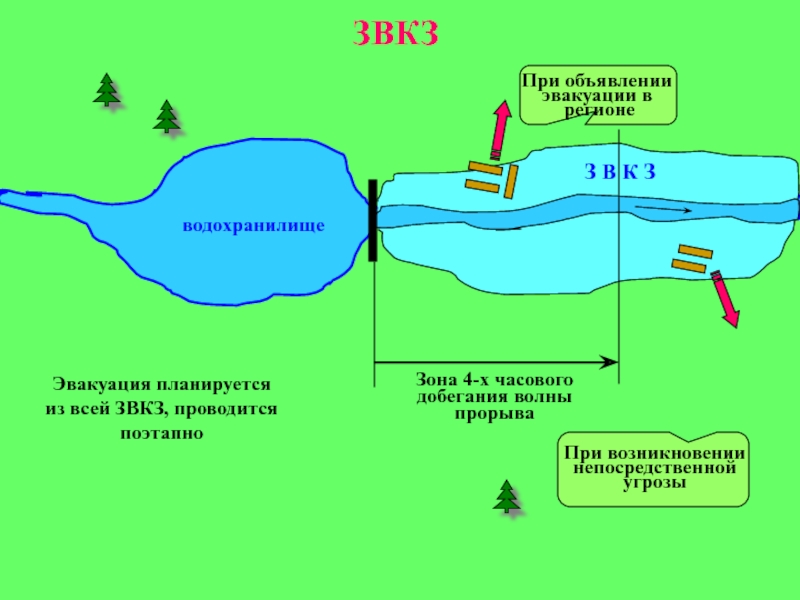 водохранилищеЗ В К ЗЗона 4-х часовогодобегания волныпрорываЗВКЗПри объявлении эвакуации в регионеПри возникновениинепосредственнойугрозыЭвакуация планируетсяиз всей ЗВКЗ, проводитсяпоэтапно
