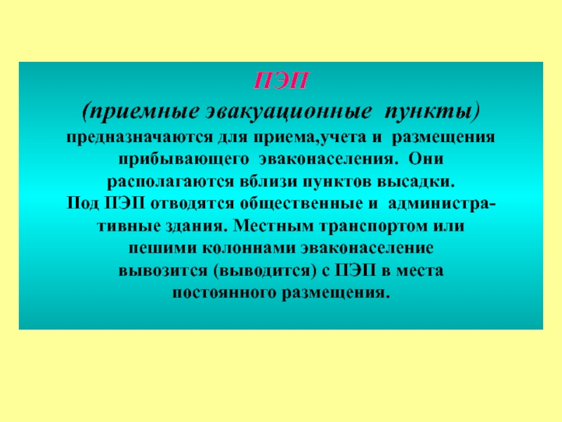 ПЭП (приемные эвакуационные пункты)предназначаются для приема,учета и размещения прибывающего эваконаселения. Они располагаются вблизи пунктов высадки. Под ПЭП