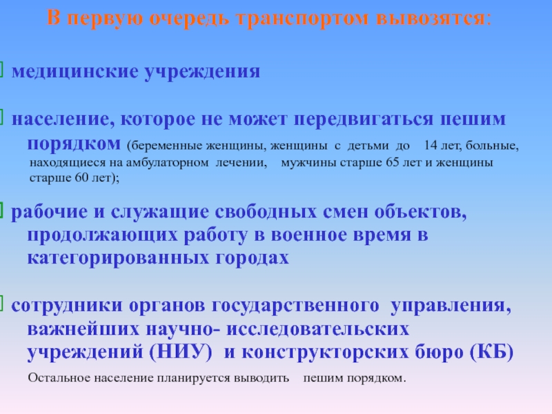 имеющегося транспорта и выводу пешим порядком населения из категорированных городов и размещению его в загородной зоне