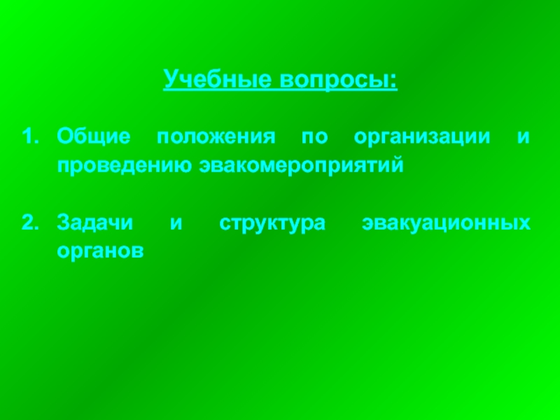 Учебные вопросы:Общие положения по организации и проведению эвакомероприятийЗадачи и структура эвакуационных органов