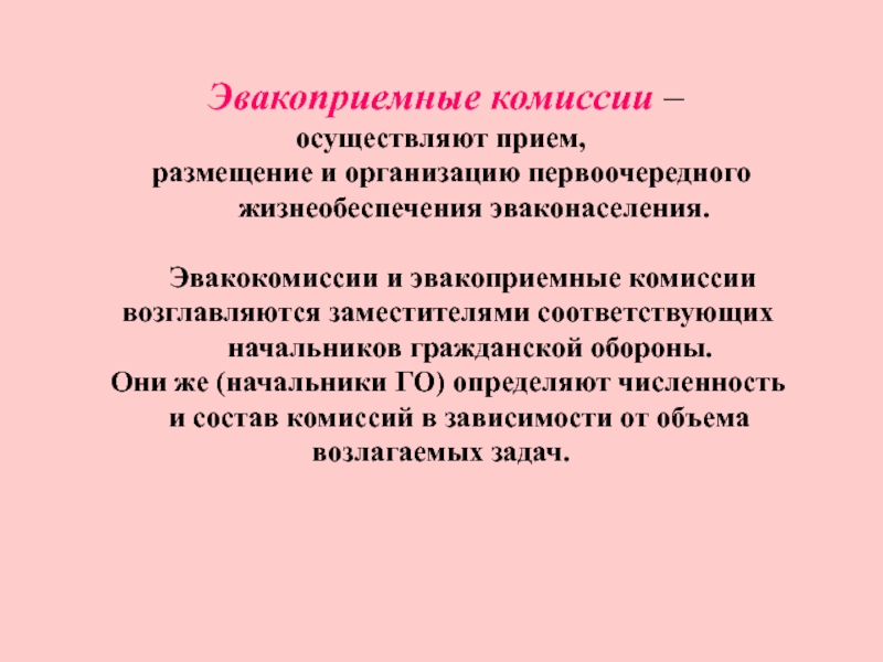 Эвакоприемные комиссии – осуществляют прием,  размещение и организацию первоочередного     жизнеобеспечения эваконаселения.