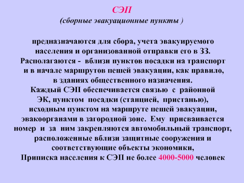 СЭП(сборные эвакуационные пункты ) предназначаются для сбора, учета эвакуируемого населения и организованной отправки его в ЗЗ. Располагаются