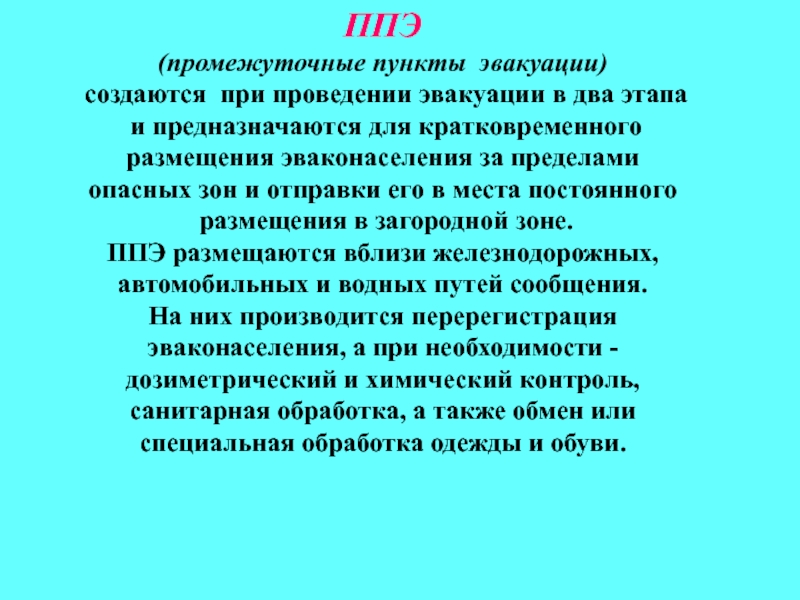 ППЭ (промежуточные пункты эвакуации) создаются при проведении эвакуации в два этапа и предназначаются для кратковременного размещения эваконаселения
