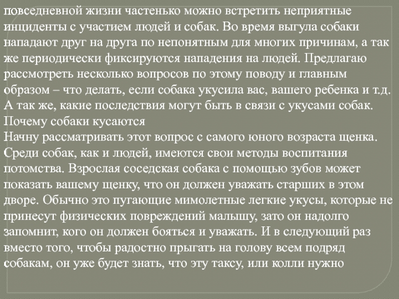 собак. Во время выгула собаки нападают друг на друга по непонятным для многих причинам, а так же периодически фиксируются нападения на людей. Предлагаю рассмотреть несколько вопросов по этому поводу и главным образом – что делать, если собака укусила вас, вашего ребенка и т.д. А так же, какие последствия могут быть в связи с укусами собак.