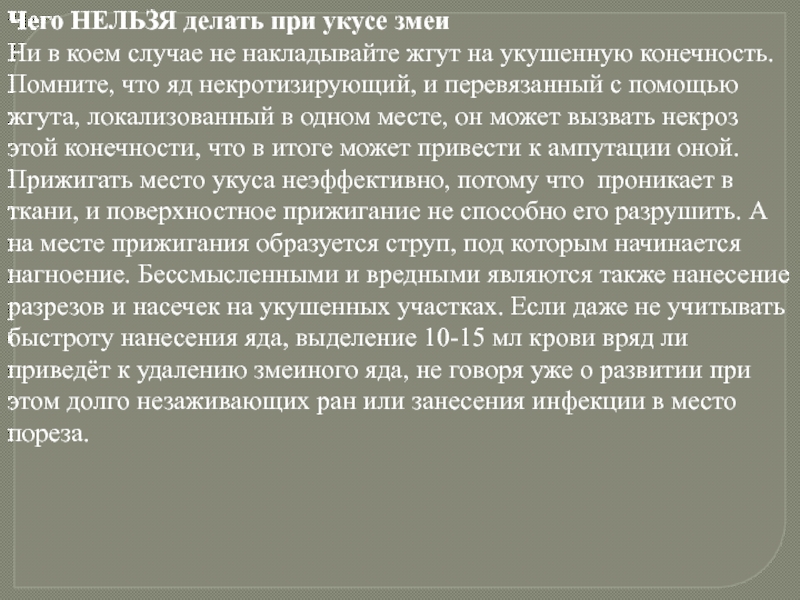 жгут на укушенную конечность. Помните, что яд некротизирующий, и перевязанный с помощью жгута, локализованный в одном месте, он может вызвать некроз этой конечности, что в итоге может привести к ампутации оной. Прижигать место укуса неэффективно, потому что проникает в ткани, и поверхностное прижигание не способно его разрушить. А на месте прижигания образуется струп, под которым начинается нагноение. Бессмысленными и вредными являются также нанесение разрезов и насечек на укушенных участках. Если даже не учитывать быстроту нанесения яда, выделение 10-15 мл крови вряд ли приведёт к удалению змеиного яда, не говоря уже о развитии при этом долго незаживающих ран или занесения инфекции в место пореза.