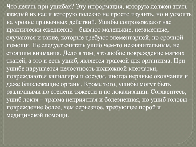 Слайд 15Что делать при ушибах? Эту информация, которую должен знать каждый из