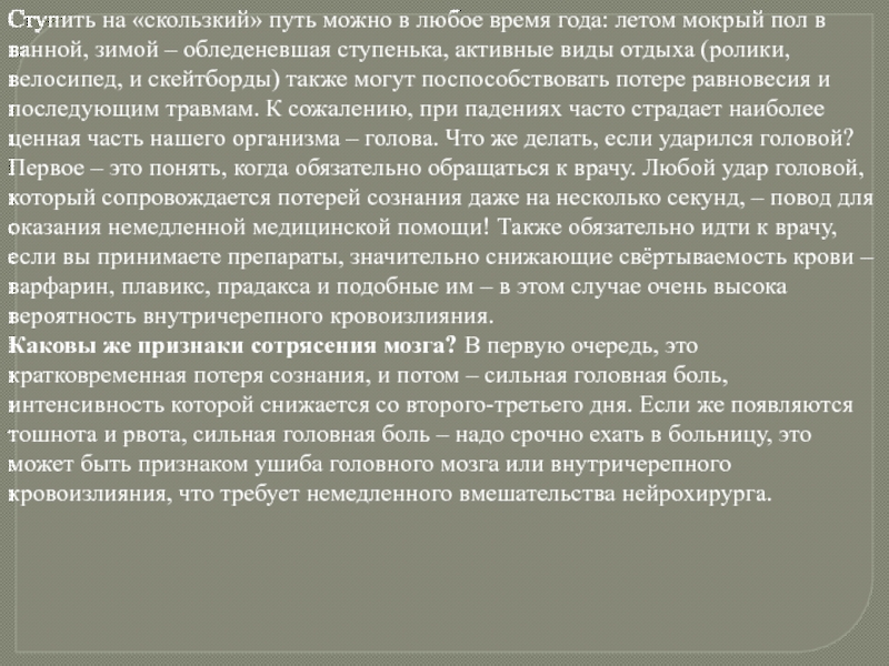 пол в ванной, зимой – обледеневшая ступенька, активные виды отдыха (ролики, велосипед, и скейтборды) также могут поспособствовать потере равновесия и последующим травмам. К сожалению, при падениях часто страдает наиболее ценная часть нашего организма – голова. Что же делать, если ударился головой?