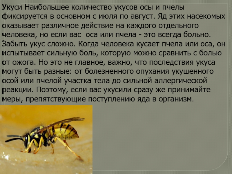 июля по август. Яд этих насекомых оказывает различное действие на каждого отдельного человека, но если вас оса или пчела - это всегда больно. Забыть укус сложно. Когда человека кусает пчела или оса, он испытывает сильную боль, которую можно сравнить с болью от ожога. Но это не главное, важно, что последствия укуса могут быть разные: от болезненного опухания укушенного осой или пчелой участка тела до сильной аллергической реакции. Поэтому, если вас укусили сразу же принимайте меры, препятствующие поступлению яда в организм.