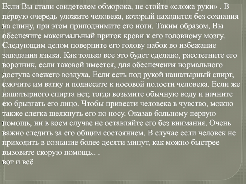 Слайд 17Если Вы стали свидетелем обморока, не стойте «сложа руки» . В