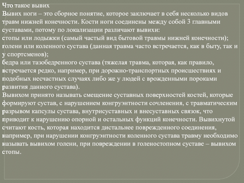 Вывихом принято называть смещение суставных поверхностей костей, которые формируют сустав, с нарушением конгруэнтности сочленения, с травматическим разрывом капсулы сустава, внутрисуставных и внесуставных связок, что приводит к нарушению опорной и остальных функций конечности. Вывихнутой считают кость, которая находится дистальнее поврежденного соединения, например, при нарушении конгруэнтности коленного сустава травму необходимо называть вывихом голени, при повреждении в голеностопном суставе – вывихом стопы.