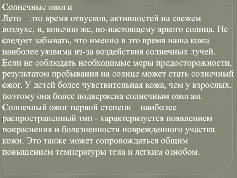 конечно же, по-настоящему яркого солнца. Не следует забывать, что именно в это время наша кожа наиболее уязвима из-за воздействия солнечных лучей. Если не соблюдать необходимые меры предосторожности, результатом пребывания на солнце может стать солнечный ожог. У детей более чувствительная кожа, чем у взрослых, поэтому она более подвержена солнечным ожогам.