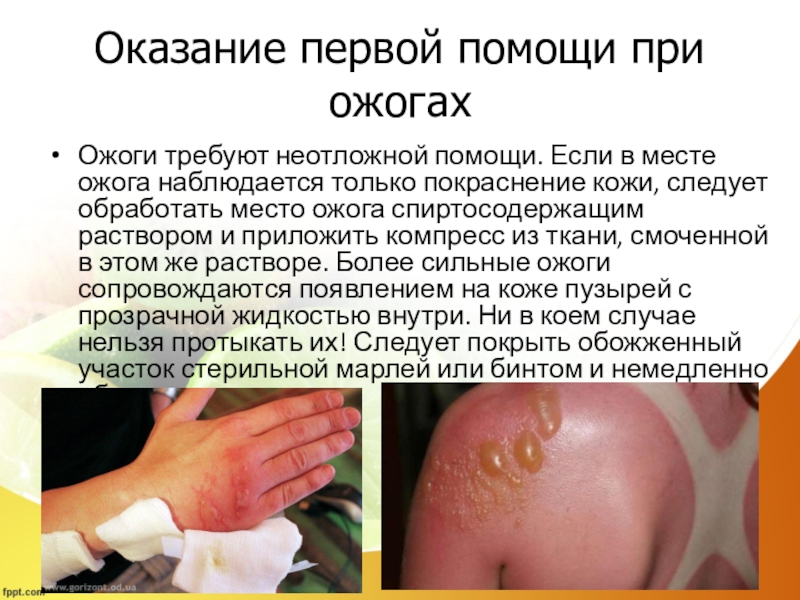 месте ожога наблюдается только покраснение кожи, следует обработать место ожога спиртосодержащим раствором и приложить компресс из ткани, смоченной в этом же растворе. Более сильные ожоги сопровождаются появлением на коже пузырей с прозрачной жидкостью внутри. Ни в коем случае нельзя протыкать их! Следует покрыть обожженный участок стерильной марлей или бинтом и немедленно обратиться к врачу.