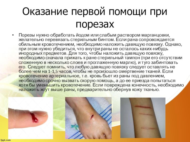 раствором марганцовки, желательно перевязать стерильным бинтом. Если рана сопровождается обильным кровотечением, необходимо наложить давящую повязку. Однако, при этом нужно убедиться, что внутри раны не осталось каких-нибудь инородных предметов. Для того, чтобы наложить давящую повязку, необходимо сначала прижать к ране стерильный тампон (при его отсутствии сложенную в несколько слоев и проглаженную марлю), и туго забинтовать его. Следует помнить, что любую давящую повязку следует оставлять не более чем на 1-1,5 часов, чтобы не произошло омертвение тканей. Если кровотечение артериальное, т.е. кровь бьет из раны под давлением, необходимо срочно вызвать скорую помощь, а до ее приезда попытаться хотя бы уменьшить кровотечение. Если повреждена конечность, необходимо наложить жгут выше раны, предварительно обернув кожу тканью.