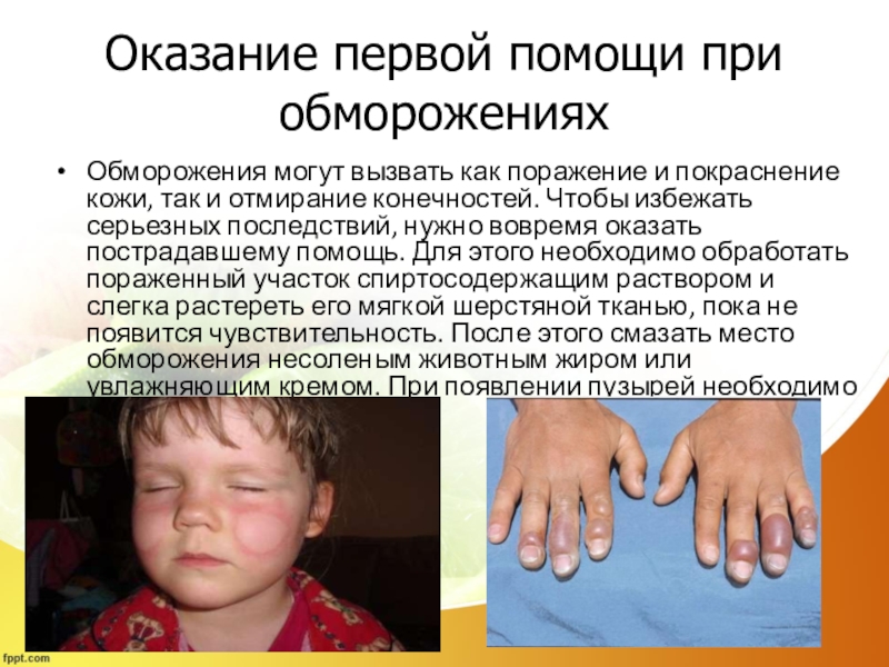 покраснение кожи, так и отмирание конечностей. Чтобы избежать серьезных последствий, нужно вовремя оказать пострадавшему помощь. Для этого необходимо обработать пораженный участок спиртосодержащим раствором и слегка растереть его мягкой шерстяной тканью, пока не появится чувствительность. После этого смазать место обморожения несоленым животным жиром или увлажняющим кремом. При появлении пузырей необходимо вызвать врача.
