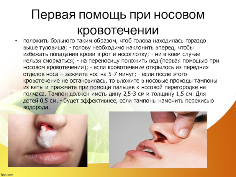 находилась гораздо выше туловища; - голову необходимо наклонить вперед, чтобы избежать попадания крови в рот и носоглотку; - ни в коем случае нельзя сморкаться; - на переносицу положить лед (первая помощью при носовом кровотечении); - если кровотечение открылось из передних отделов носа – зажмите нос на 5-7 минут; - если после этого кровотечение не остановилась, то вложите в носовые проходы тампоны из ваты и прижмите при помощи пальцев к носовой перегородке на полчаса. Тампон должен иметь дину 2,5-3 см и толщину 1,5 см. Для детей 0,5 см. - будет эффективнее, если тампоны намочить перекисью водорода.
