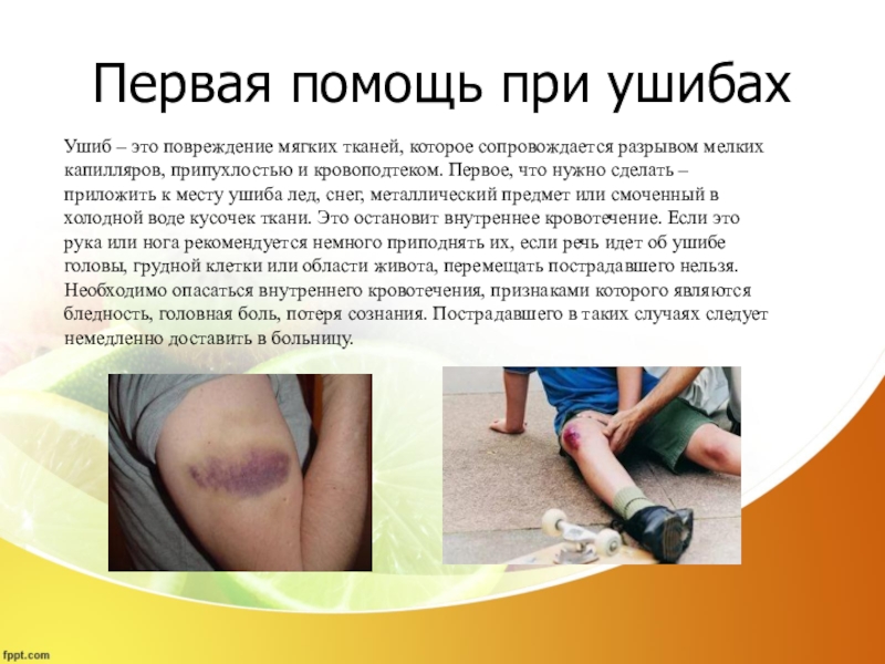 сопровождается разрывом мелких капилляров, припухлостью и кровоподтеком. Первое, что нужно сделать – приложить к месту ушиба лед, снег, металлический предмет или смоченный в холодной воде кусочек ткани. Это остановит внутреннее кровотечение. Если это рука или нога рекомендуется немного приподнять их, если речь идет об ушибе головы, грудной клетки или области живота, перемещать пострадавшего нельзя. Необходимо опасаться внутреннего кровотечения, признаками которого являются бледность, головная боль, потеря сознания. Пострадавшего в таких случаях следует немедленно доставить в больницу.