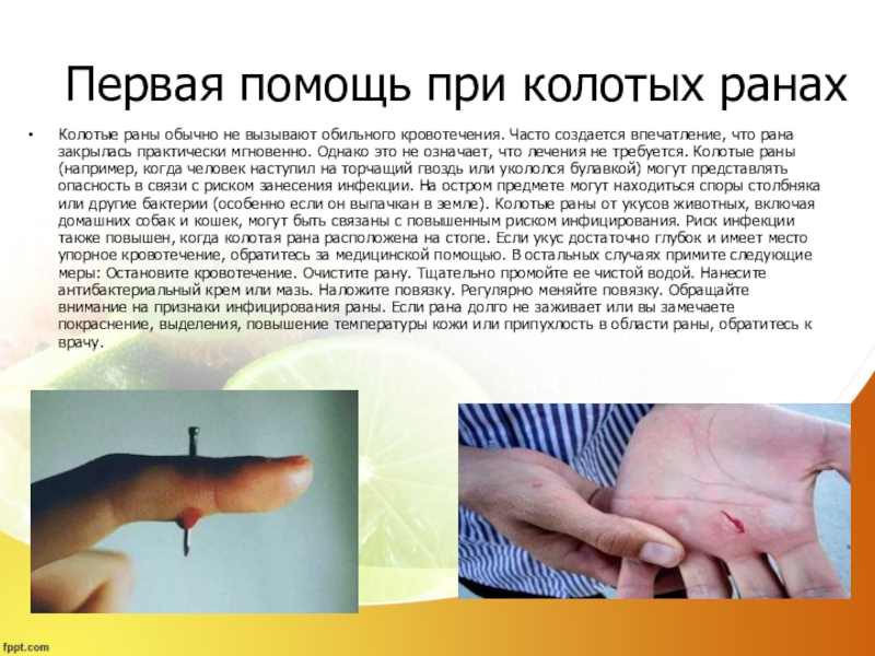 кровотечения. Часто создается впечатление, что рана закрылась практически мгновенно. Однако это не означает, что лечения не требуется. Колотые раны (например, когда человек наступил на торчащий гвоздь или укололся булавкой) могут представлять опасность в связи с риском занесения инфекции. На остром предмете могут находиться споры столбняка или другие бактерии (особенно если он выпачкан в земле). Колотые раны от укусов животных, включая домашних собак и кошек, могут быть связаны с повышенным риском инфицирования. Риск инфекции также повышен, когда колотая рана расположена на стопе. Если укус достаточно глубок и имеет место упорное кровотечение, обратитесь за медицинской помощью. В остальных случаях примите следующие меры: Остановите кровотечение. Очистите рану. Тщательно промойте ее чистой водой. Нанесите антибактериальный крем или мазь. Наложите повязку. Регулярно меняйте повязку. Обращайте внимание на признаки инфицирования раны. Если рана долго не заживает или вы замечаете покраснение, выделения, повышение температуры кожи или припухлость в области раны, обратитесь к врачу.