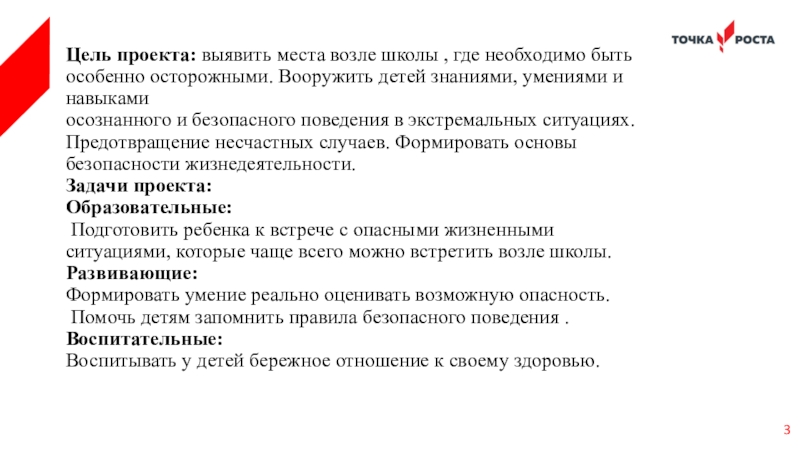 Цель проекта: выявить места возле школы , где необходимо быть особенно осторожными. Вооружить детей знаниями, умениями