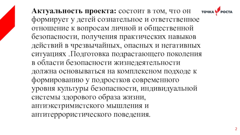 Актуальность проекта: состоит в том, что он формирует у детей сознательное и ответственное отношение к вопросам личной и общественной безопасности, получения практических навыков действий в чрезвычайных, опасных и негативных ситуациях .Подготовка подрастающего поколения в области безопасности