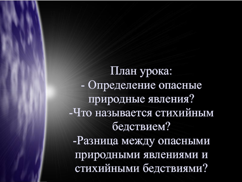 План урока: - Определение опасные природные явления? -Что называется стихийным бедствием? -Разница между опасными